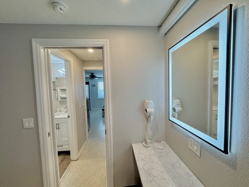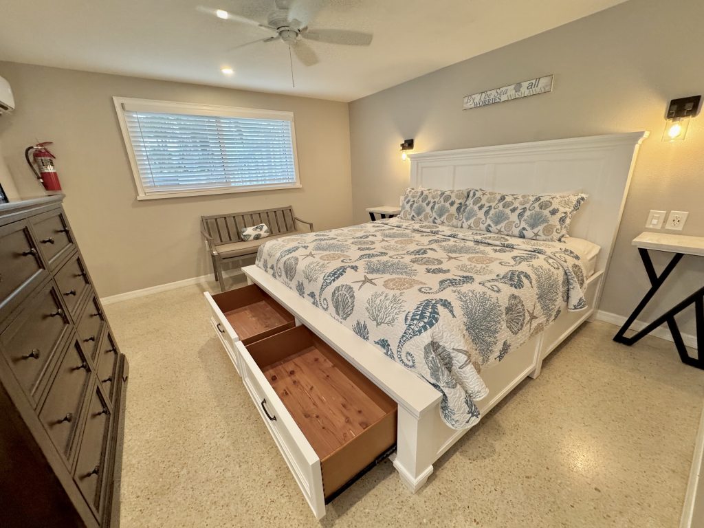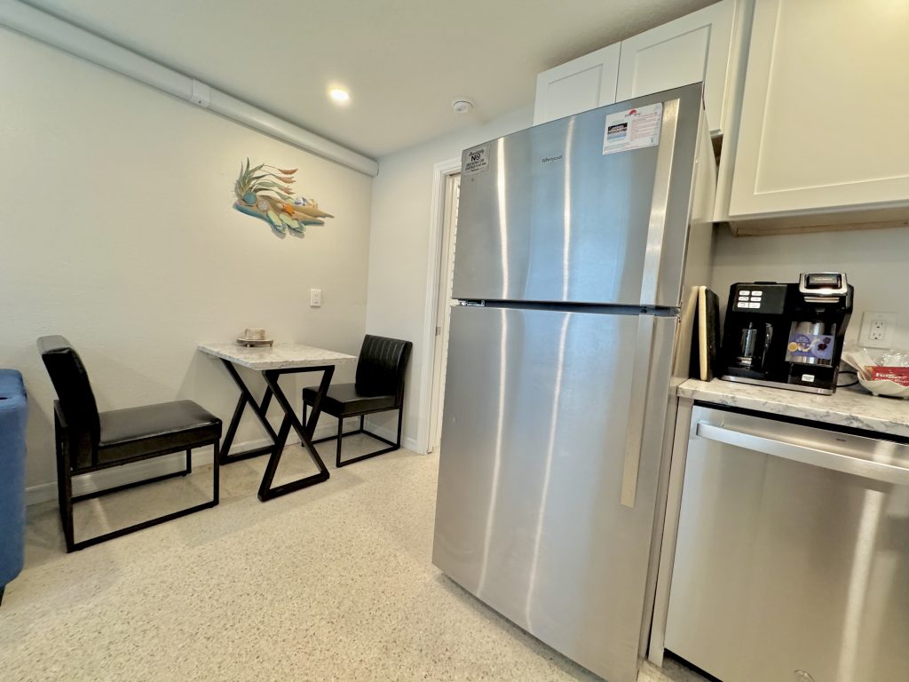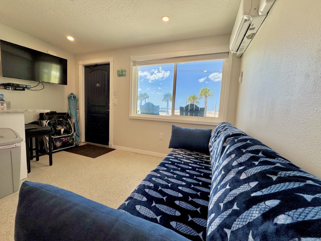 The kitchen with quality appliances & utensils including blender & wine glasses provided, wall mounted hair dryers & lighted mirror (bedroom vanity/desk), Iron & small board, large beach towels, 2 premium beach chairs (plus: more in patio storage), 1 beach buggy, 1 quality large umbrella & 6-pack cooler, HD Flat screen LED TV’s with free cable channels (1-43 inch and one 50 inch TV’s), quality queen sofa sleeper, ceiling fans in the sleeping areas, ground level enclosed area with Stainless Steel large gas grill plus side searing cooker & LED spot / grill light (wall switch), sun bathing area shared enclosed patio area, 2 beach showers & foot washes & hose, 1 front door parking space for 1 bedroom villas each with addition day time only public parking a 1/2 block away for Weddings or visitors. Other 1-2 bedroom villas for rent (if/when available).