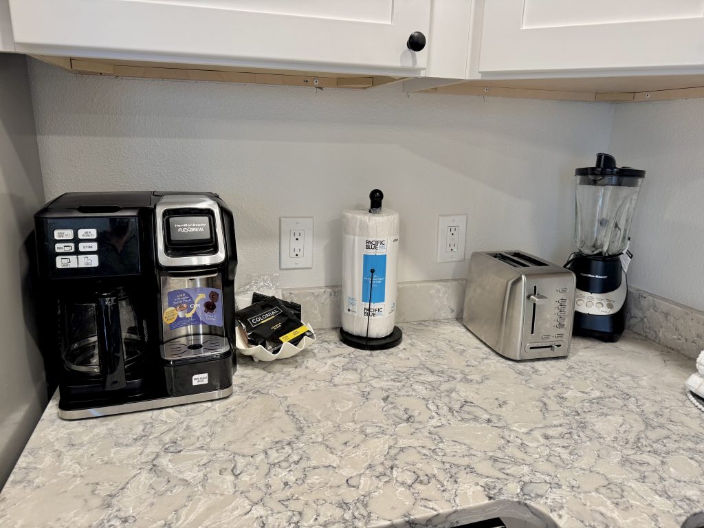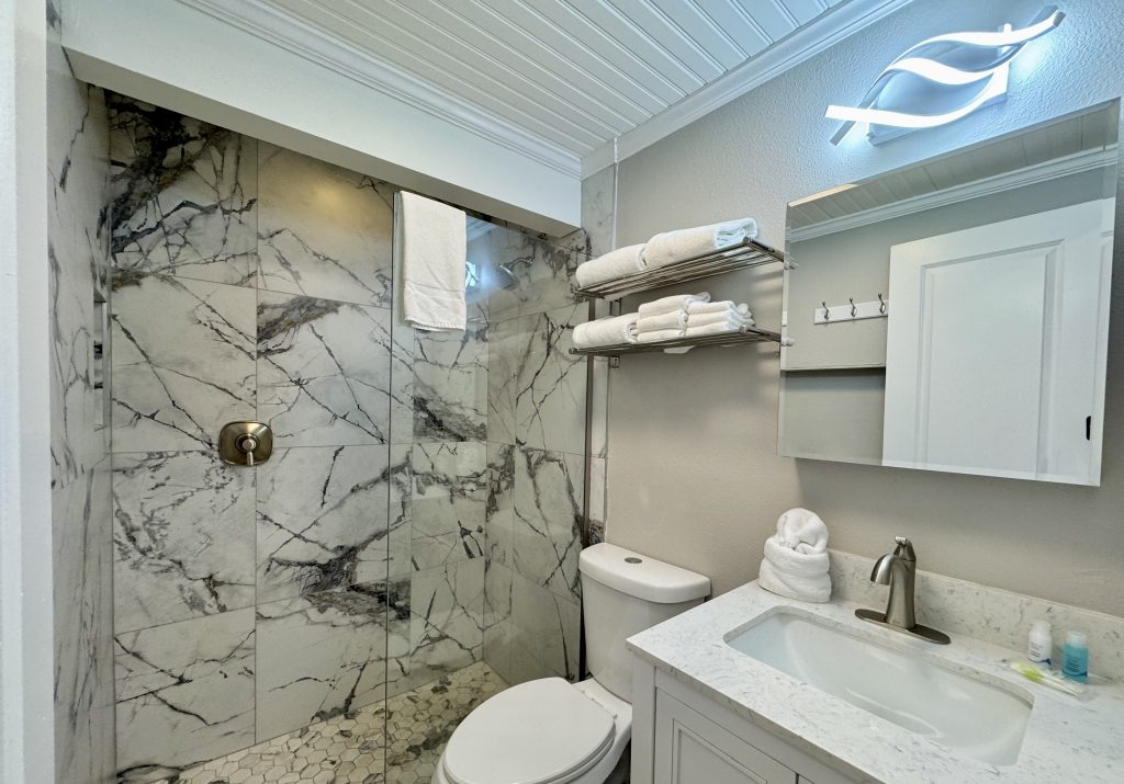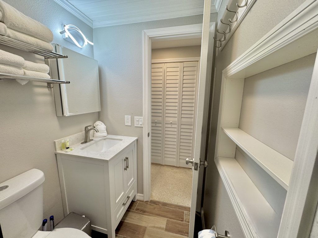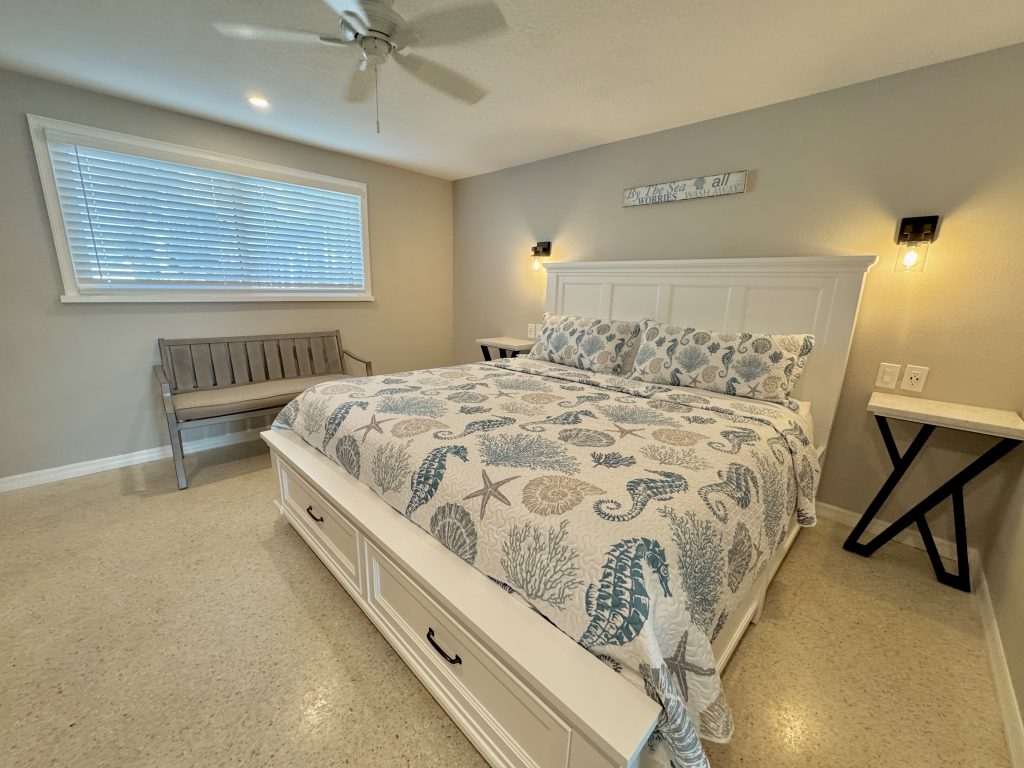 The kitchen with quality appliances & utensils including blender & wine glasses provided, wall mounted hair dryers & lighted mirror (bedroom vanity/desk), Iron & small board, large beach towels, 2 premium beach chairs (plus: more in patio storage), 1 beach buggy, 1 quality large umbrella & 6-pack cooler, HD Flat screen LED TV’s with free cable channels (1-43 inch and one 50 inch TV’s), quality queen sofa sleeper, ceiling fans in the sleeping areas, ground level enclosed area with Stainless Steel large gas grill plus side searing cooker & LED spot / grill light (wall switch), sun bathing area shared enclosed patio area, 2 beach showers & foot washes & hose, 1 front door parking space for 1 bedroom villas each with addition day time only public parking a 1/2 block away for Weddings or visitors. Other 1-2 bedroom villas for rent (if/when available).